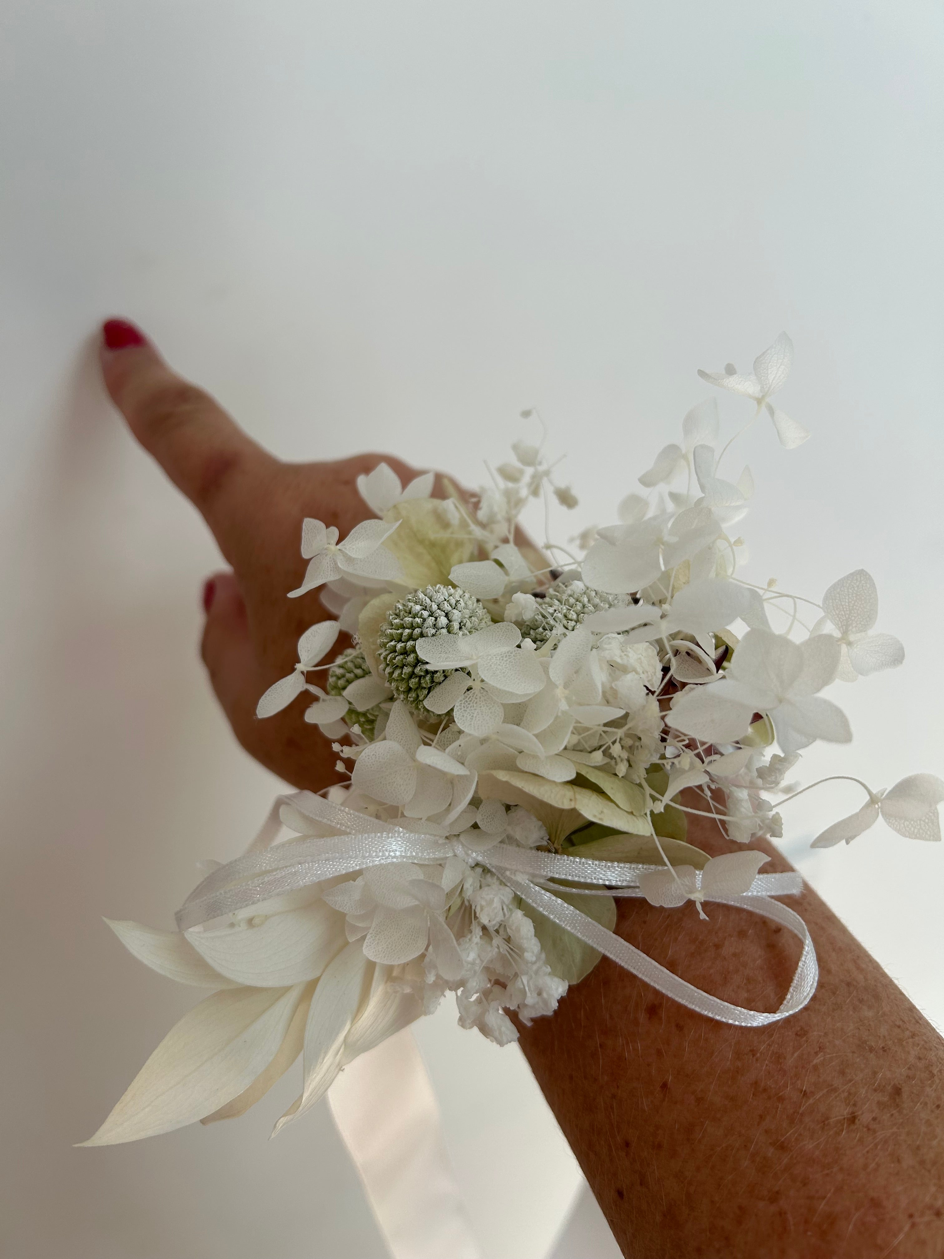 Dried bespoke floral corsage. It comes on a white ribbon