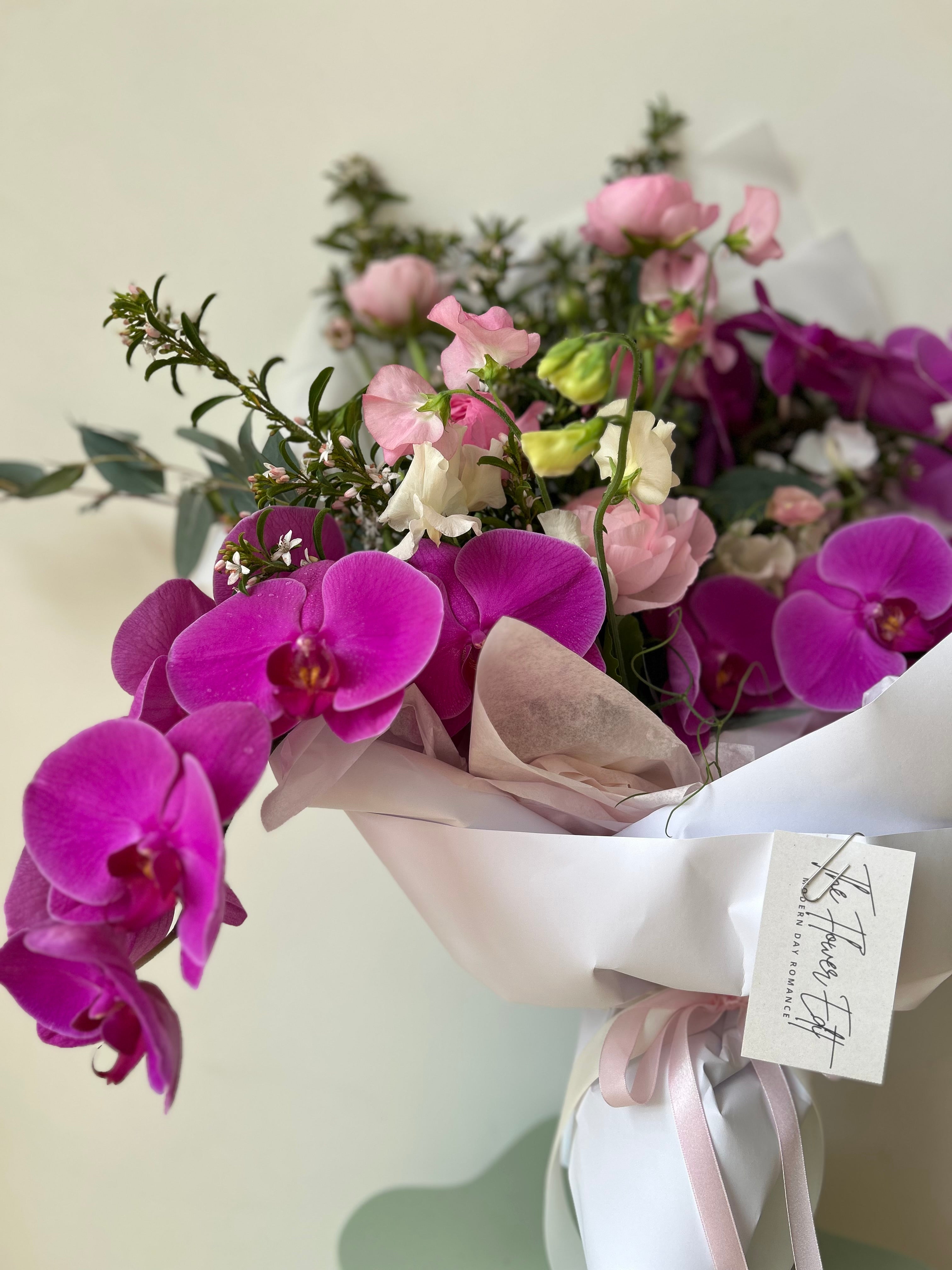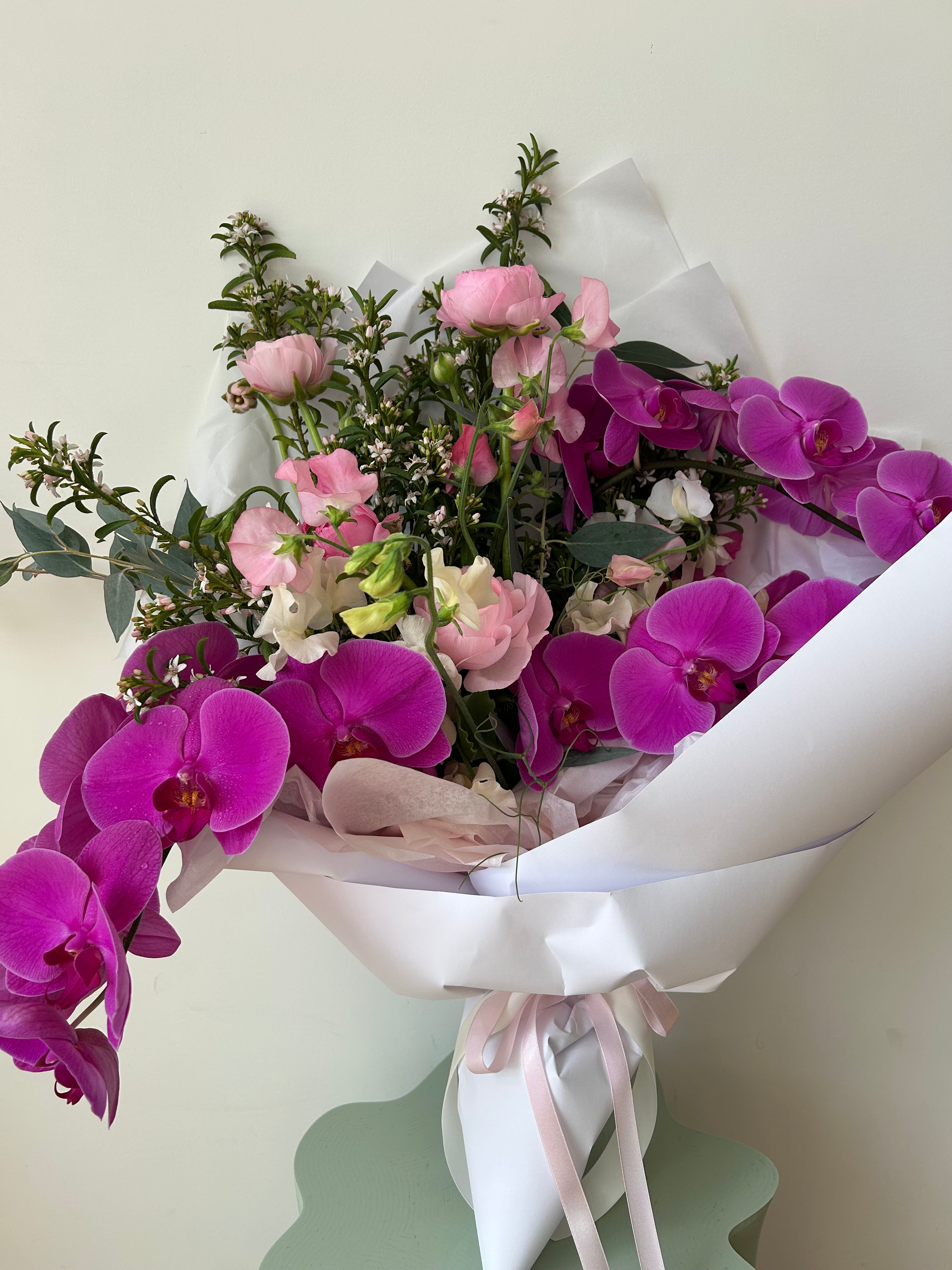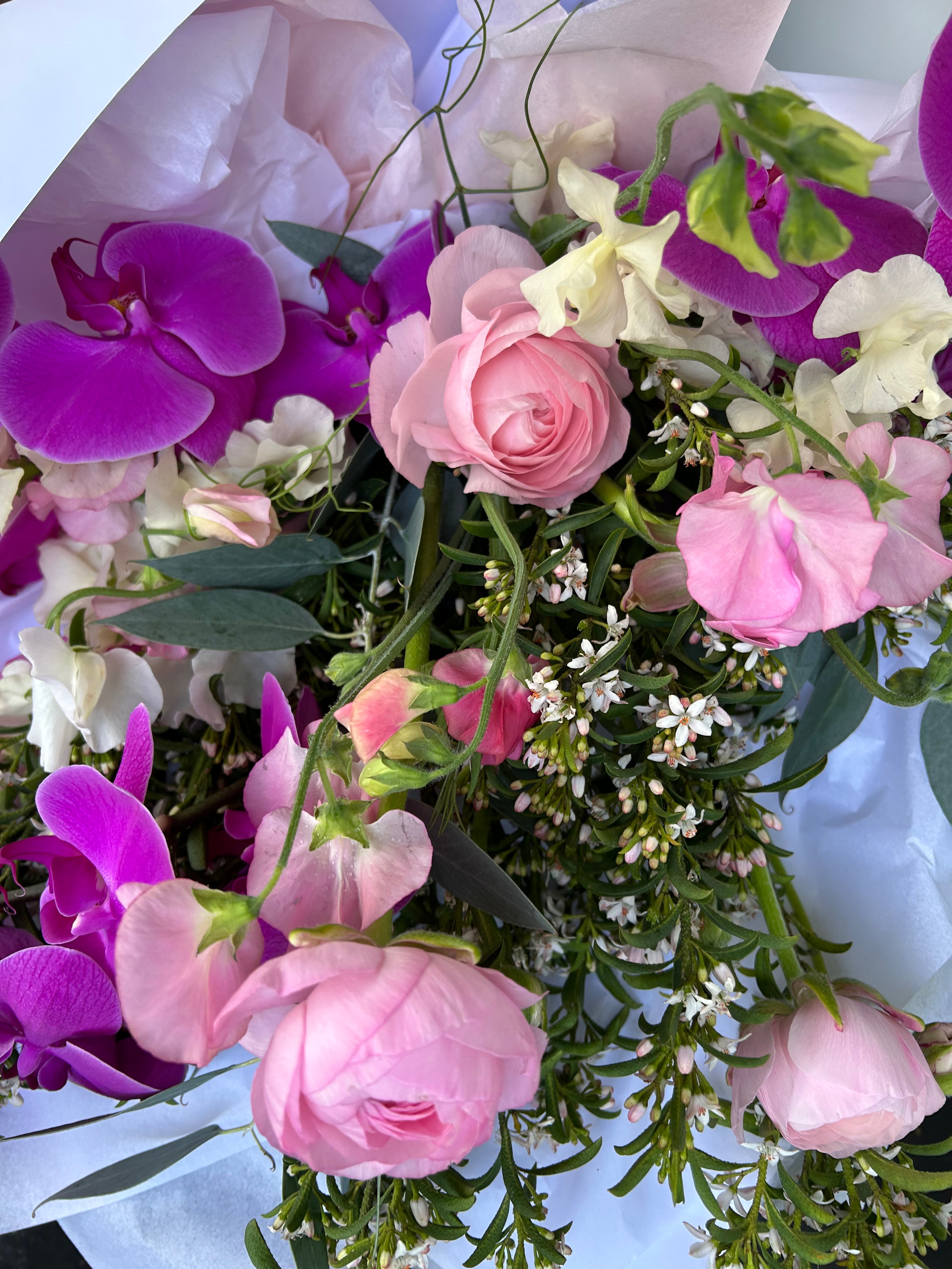 A stunning bunch of flowers including Phalaenopsis Orchids, Roses and spring blooms